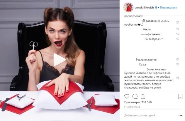 В своем аккаунте в Instagram Анна Хилькевич опубликовала весьма устрашающее фото, на котором она запечатлена в очень пугающем, по словам пользователей, образе. Актриса похожа на некую дьяволицу, имеющую связь с потусторонним миром. Фанаты не оценили творческого порыва артистки и заявили, мол, «нам Бузовой хватило!» с ее символом супруги Дьявола Бафомет, и вообще, она - «криповая». При этом девизом комментаторов стала фраза «вызывайте экзорциста». По всей видимости, такой «мем» широко распространен среди пользователей.