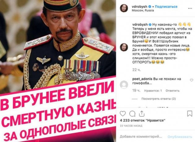 Накануне стало известно, что в государстве Бруней с населением суть больше 400 тысяч человек, находящемся в Юго-Восточно Азии, отныне гомосексуальные половые отношения будут караться согласно законам Шариата, т.е смертной казнью. Музыкальный продюсер и композитор Виктор Дробыш на своей странице в Instagram поддержал нововведение, посвятив этому событию достаточно эмоциональный, откровенный, однако сильно возмутивший его подписчиков и других пользователей Сети пост. Дробыш сообщил, что теперь у него есть мечта, чтобы на «Евровидении» победил представитель Брунея, и музыкальный конкурс «поехал» в эту азиатскую страну. По мнению продюсера, если это произойдет, «шоубизик» поменяется, появятся «новые лица», да и вообще, станет «просто интересно». К слову, в конце поста Виктор Яковлевич отметил, что смертная казнь – это «слишком», достаточно просто «отпороть».