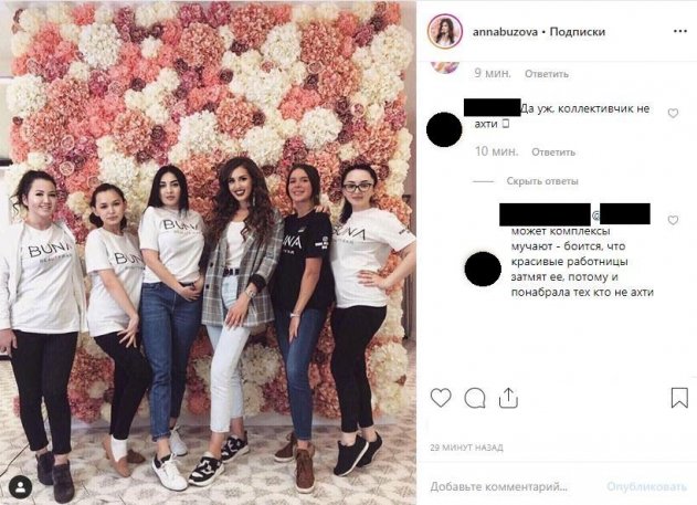 Однако пользователи соцсети заметили, что на фоне начальницы с ярким макияжем, укладкой и в стильном наряде все окружающие девушки выглядят блекло. Именно поэтому критики начинающей бизнесменши решили, что Анна Бузова самоутверждается за счет некрасивых сотрудниц, ведь, возможно, ее саму «комплексы мучают». На самом деле, сложно представить, чтобы знаменитую красотку мучало хоть какое-то недовольство ее внешностью, хотя не исключено, что доля зависти более популярной и богатой сестре у нее может быть. Возможно, самооценка у Анны из-за мегауспешной сестры так сильно упала, что теперь она даже боится выглядеть не красивой на фоне своих сотрудниц, почему и не набирает слишком красивых в штат.