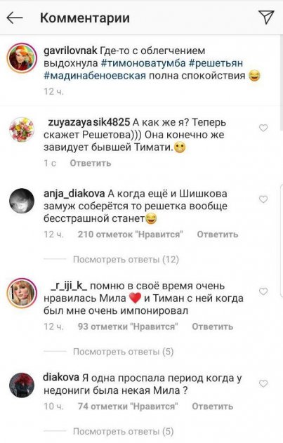 В Instagram-группе «Gavrilovnak» появилась фотография Милы с будущим мужем, которую лайкнула Анастасия Решетова, очевидно, она радуется, что у нее на минус 1 конкурентку стало меньше, либо надеется, что Тимати назло бывшей женится на ней.