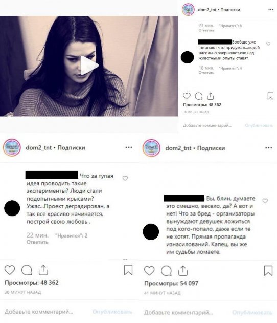 Комментаторы пришли к выводу, что все эти эксперименты слишком далеко увели шоу от изначальной цели – построения любви между участниками. Проект деградировал, к участникам относятся как животным, а при этом, как бы между прочим, проводиться навязчивая «пропаганда изнасилований», уверены пользователи соцсети. Из-за подобного произвола, «Дом-2» просто ломает судьбы своим участникам, решил один из зрителей шоу.