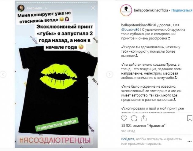 Недавно Ольга Бузова написала своим подписчикам, что возмущена плагиатом другим дизайнером. Оказалось, что ее коллега, российский дизайнер Белла Потемкина создала футболки с принтом «Губы», который еще несколько лет назад запустила телезвезда. Дизайнерша Бузова крайне возмутилась тем, что везде ее копируют и не стесняются. Потемкина не ожидала такого «наезда» со стороны уже бывшей подруги и незамедлительно ответила на скандальную «сторис» на своей странице в социальной сети.