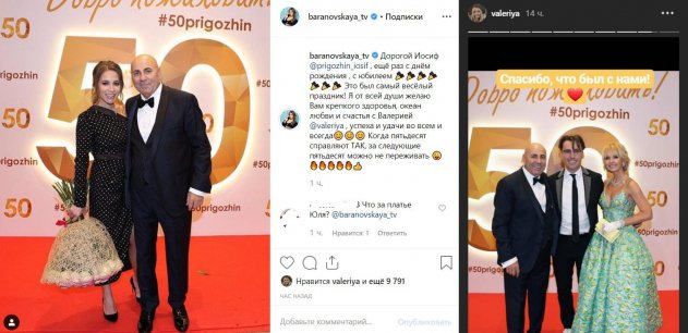 Очередные разговоры о связи Галкина с Барановской начались после торжества в честь 50-летия Иосифа Пригожина. 2 апреля продюсер устроил роскошную вечеринку в честь дня рождения, на которой собрались многие знаменитости. Присутствовал на юбилее Пригожина и Галкин, однако без своей супруги. Опубликованная на странице Валерии фотография подтверждает, что Примадонна осталась дома. «Спасибо, что был с нами!», - подписала общее фото с Максимом певица. Кроме того, Пугачева не засветилась ни на одном фото или видео с шумной вечеринки. Зато на торжество пришла Юлия Барановская, которой приписывали роман с юмористом.