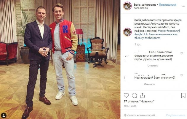 Всплывшая публикация в сети может говорить о том, что Галкин не такой уж «белый и пушистый», каким его представляют поклонники. Юморист «засветился» в самом дорогом клубе Москвы - Soho Rooms. Роскошное ночное заведение в центре столицы открывает свои двери лишь избранным персонам. На снимке Галкин запечатлен, видимо, с одним из учредителей клуба. Вероятно, Максим – частый гость в данном заведении. Судя по комментариям, некоторых пользователей смутило то, что супруг Пугачевой «отрывается» по ночам, оставив жену дома.