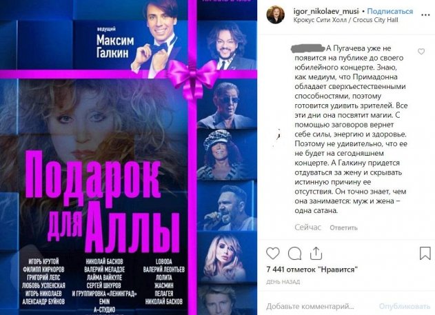 Также медиум отметил, что Максим Галкин не случайно стал ведущим сегодняшнего мероприятия – юморист обязательно придумает, как оправдать отсутствие жены, дабы не выдать ее магические тайны. Как отметил эксперт, Галкин знает о способностях супруги – юморист упорно скрывает ритуалы жены перед юбилеем. «Муж и жена – одна сатана», - отметил экстрасенс. По словам медиума, 17 апреля зрители будут приятно удивлены – Пугачева предстанет перед публикой, полна сил и энергии.
