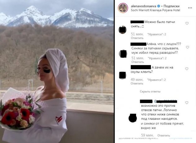На днях российские СМИ распространили информацию о том, что телеведущая Алёна Водонаева подала на развод со своим мужем Алексеем Косинусом, с которым в законном браке прожила всего два года. Сама Водонаева отказывать комментировать свой развод и говорить на эту тему, чем и провоцирует массу слухов в Интернете. Одной из версией поклонников стало то, что Алексей мог избивать свою звездную жену, а из-за этого звезда бросила супруга. Недавно Алёна опубликовала новое фото с патчами под глазами. Фанаты сразу же стали говорить, что телезвезда может скрывать синяки, которыми её якобы мог «наградить» почти бывший муж.