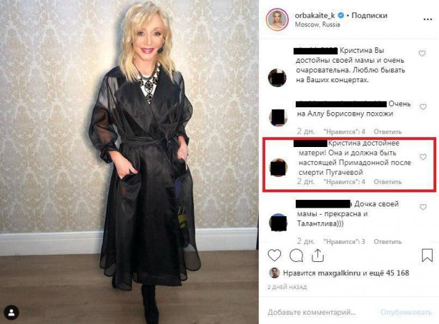 Подписчики Орбакайте отметили поразительное сходство Кристины с Пугачёвой и предположили, что после смерти Пугачёвой ее дочь может стать новой Примадонной, так как она «достойнее матери». Также пользователи подчеркнули, что внешне Орбакайте «копия мамочки» и признались, что можно легко перепутать Аллу Борисовну и Кристину.