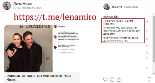 Подписчики блогера стали активно обсуждать новость. «Мужик недолго горевал», «И правильно! Хотя он и Собчак друг друга стоят!», - подискутировали одни, а другие выразили мнение, что на самом деле между коллегами нет никакой связи, - «Имеет право, но, думаю, ничего там нет».
