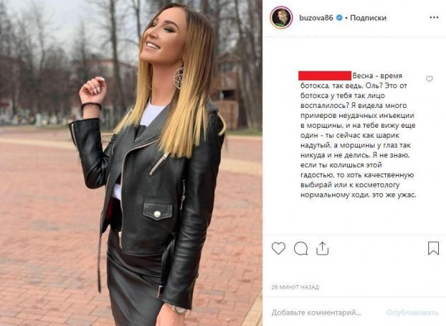«Это от ботокса у тебя лицо так воспалилось?» - спросил один из комментаторов, который и допустил, что Бузова могла изуродовать внешность уколами некачественного ботокса. «Если ты колешься этой гадостью, то хоть качественную выбирай или к косметологу нормальному ходи, это же ужас», - заключает поклонник.