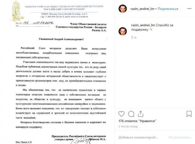 В марте текущего года продюсер группы «Ласковый май» Андрей Разин выступил против солиста и лидера коллектива «Лениград» Сергея Шнурова из-за его высказываний о Москве. Деятель культуры глубоко оскорбился тем, что в своей речи, говоря о столице России, музыкант использовал матерные слова. Теперь Разин требует от Шнурова извинений, а кроме того обещает заплатить пять миллионов рублей тому, кто совершит для него заказное преступление – побьет Шнурова. Из-за подобных угроз уже сам артист обратился в полицию, из-за чего Разина вызывали на допрос. Однако, сдаваться тот не намерен, и в его «войне» против рокера Разина поддержали ветераны. На своей страничке в соцсети продюсер поделился письмом от «Российского союза ветеранов». В послании глава организации пишет, что артисты действительно «выражались грязно и нецензурно», а это негативно воздействует на молодежь.