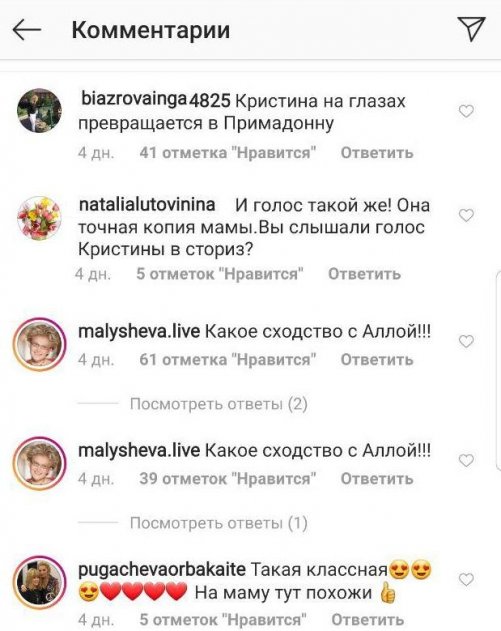 Вчера певица добавила stories с концерта в Красноярске, на видео артистка благодарит зрителей, что они пришли на ее концерт. После услышанного, под фотографиями Кристины, вновь посыпался шквал комментариев, только в этот раз подписчики узнали в голосе Кристины – голос Аллы Борисовны. «И голос такой же! Она точная копия. Звучит голос Аллы!», «Кристина на глазах превращается в Примадонну»», «Как под копирку. Может, выступишь за маму на концерте 15 апреля?», - пишут пользователи.