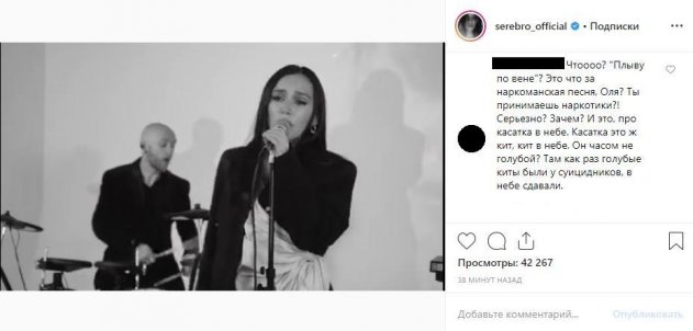 Сегодня день рождения празднует экс-участница Serebro Ольга Серябкина, но, несмотря на праздник, звезда сама сделала подарок своим поклонникам – вышла ее новая песня «Косатка в небе». Отрывок из видео с «живым» исполнением этой песни артистка опубликовала на своей страничке в соцсети, и в нем есть следующие строки: «Я как косатка в не небе, плыву, плыву по вене. Любовь с тобой вне времени». Именно эти слова и смутили некоторых поклонников знаменитости, которые предположили, что она спела о «наркотиках».