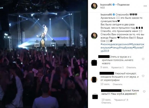 Недавно популярная телеведущая и певица Ольга Бузова дала свой сольный концерт в городе Архангельск. По словам самой знаменитости, её шоу прошло отлично, а людей было «в два раза больше, чем в прошлом году». Однако сами поклонники не разделили с Бузовой её восторга от концерта. В комментариях в микроблоге артистки зрители раскритиковали концерт Ольги в Архангельске и заявили, что девушке стоит больше времени уделять вокалу или вовсе не заниматься пением.