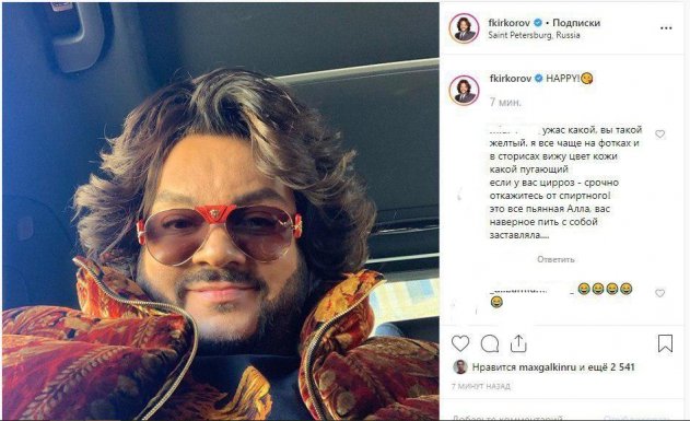 Недавно Филипп Киркоров ужаснул подписчиков новым сэлфи-фото, сделанным в салоне авто. Если точнее, фанатов напугал желтый цвет лица артиста. Подписчики предположили, что артист болен циррозом печени, который спровоцирован употреблением спиртных напитков. «Это все пьяная Алла, вас, наверное, пить с собой заставляла», - отметили фолловеры.