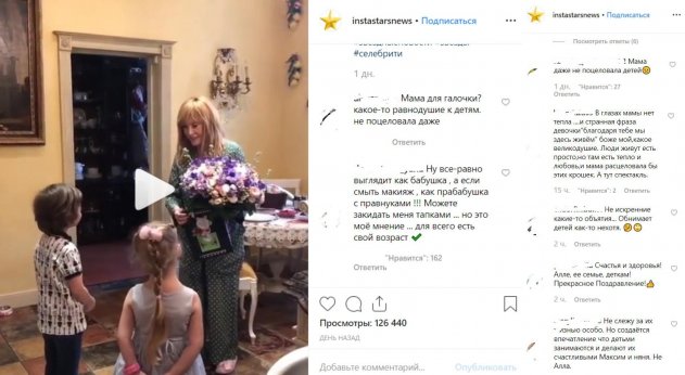 Вчера примадонна российской эстрады Алла Пугачева отмечала день рождения. На своей странице Максим Галкин опубликовал трогательное видео, на котором Лиза и Гарри поздравляют маму с 70-летием. Поклонники пришли в восторг от увиденного, в очередной раз выразив свое восхищение талантливыми детьми. Однако многие интернет-эксперты назвали ролик юмориста постановкой. По мнению пользователей сети, дети как будто поздравляли чужую тетю, а не родную мать. Кроме того, фолловеры остались недовольны тем, что и Пугачева отнеслась к Лизе и Гарри как к чужим детям. Певица, отмечают фанаты, даже не поцеловала наследников, а ее объятия показались поклонникам неискренними. «В глазах мамы нет тепла», - пишут в комментариях пользователи, которые уверены, что другая бы сразу же расцеловала своих наследников и не выпускала бы их из объятий.