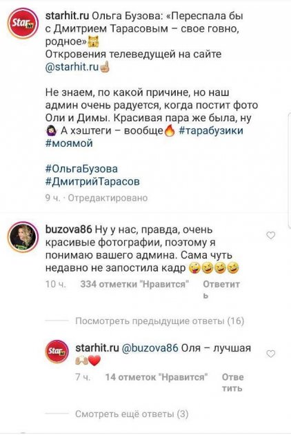 Скорее всего, Ольга Бузова посчитала, что просто интервью - это скучно и окончательно решила добить молодую модель, она прокоментировала на странице «starhit» фотографию, на которой она сидит с Тарасовым и выглядит очень счастливой. «Ну у нас правда очень красивые фотографии. Сама чуть недавно не запостила кадр», - написала Оля. После ее комментария посыпался шквал комментариев от подписчиков редакции: «Димас увидит, Олечке позвонит. Сам скучает по ней», «Дааа, красивая пара была». Скорее всего, Ольга Бузова будет всегда в жизни Дмитрия и только одним видом вызывать нервный тик у Тарасова.