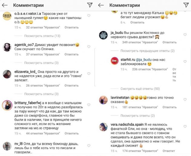Складывается впечатление, что новоиспечённая певица поставила перед собой цель отомстить Анастасии Костенко и доказать, что она лучше. Оля довольно быстро набрала популярность, сейчас она занимает высшие позиции хит-парада, Rutube, у неё самое большое количество подписчиков в Instagram. Анастасия Костенко в свою очередь живет прошлой жизнью Ольги Бузовой, нигде не работает и тратит ровно столько, сколько ей выделяет муж. Анастасия ранее никак не реагировала на высказывание Ольги Бузовой, но после вчерашнего интервью о желании Ольги переспать с её мужем она психанула и заблокировала «Starhit» в сети Instagram.
