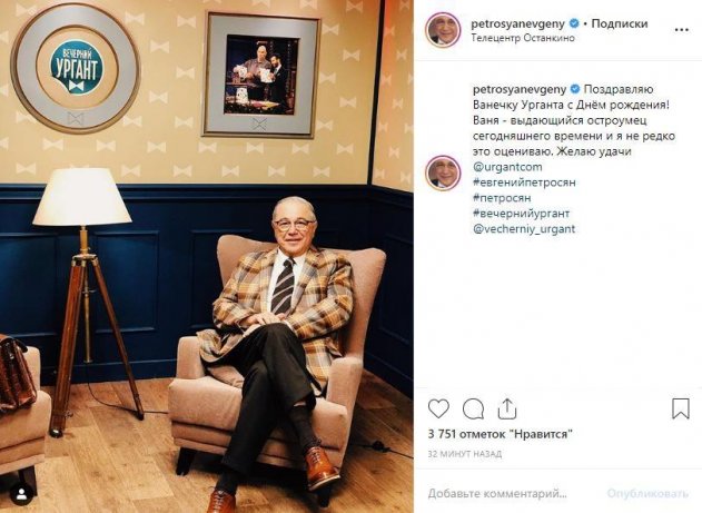 При этом не составит большого труда заметить, что на фото, которое Петросян прикрепил к поздравлению, видно, что сидит юморист в студии «Вечернего Урганта». Это можно понять уже по тому, что на стене висит логотип передачи.