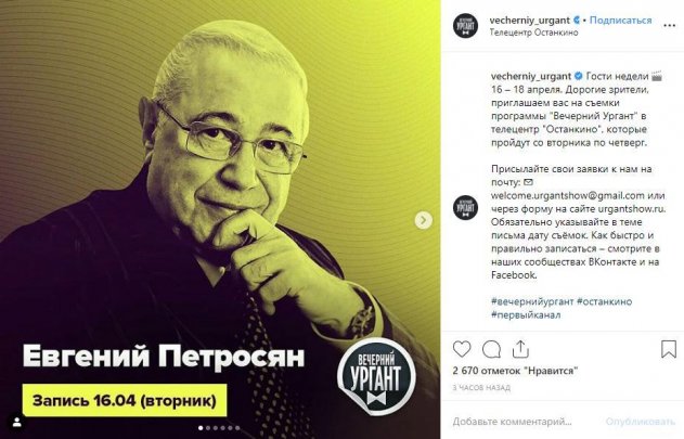 Дело в том, что Петросян является приглашенным гостем этого шоу 16 апреля. Недавно на официальной странице проекта было объявлено о наборе зрителей на данное шоу и были также перечислены приглашенные гости. Возможно, основатель «Кривого зеркала» только потому решил поздравить Урганта, ведь побоялся быть невнимательным и невежливым в отношении ведущего. Но может ли быть так, что кроме того Ваганыч, как называют его поклонники и коллеги, просто подлизался к Урганту из-за страха унижения на его передаче?
