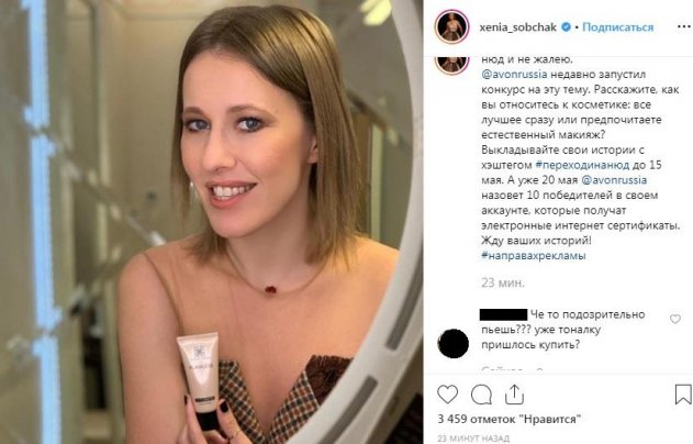 Ксения Собчак нечасто рекламирует что-то на своей странице в социальной сети, но обычно такая реклама сразу вызывает бурю эмоций у хейтеров. На этот раз телеведущая решила рассказать своим подписчикам, насколько любит пользоваться косметикой марки Avon. Во-первых, их продукция доступна по цене, поэтому для Ксении странно ее использовать. Поклонники вспомнили, что обычно она приобретает товары Valmont, которые стоят более 10 тысяч рублей, поэтому поверить в то, что женщина действительно пользуется рекламируемыми вещами, просто невозможно.