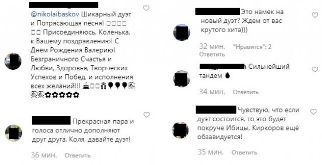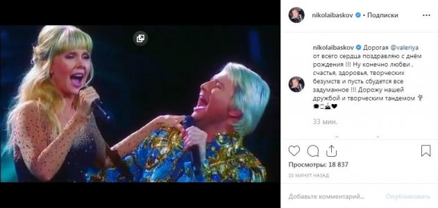 42-летний «натуральный блондин» Николай Басков ежегодно очень эмоционально поздравляет свою коллегу певицу Валерию с днём рождения. Этот год также не стал исключением и ради 51-летней артистки Басков нашел архивное видео с их совместного выступления, который и опубликовал в своем личном микроблоге в Instagram. Поклонники были в восторге от дуэта знаменитостей, а некоторые фолловеры Баскова даже предложили, что таким поступком Николай намекнул на новый дуэт с певицей.