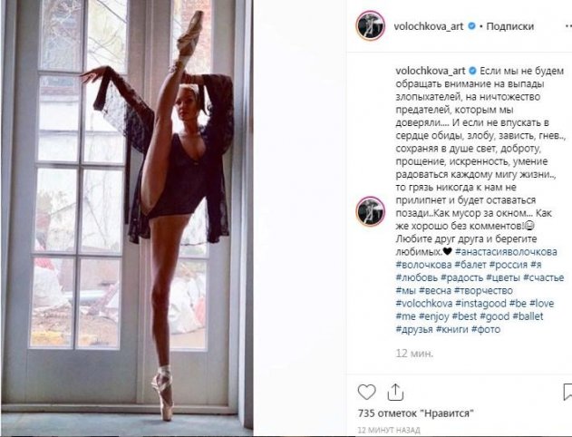 По словам экс-балерины, если не обращать внимание на «выпады, ничтожество предателей», очиститься от злобы, гнева и зависти, и заполнить душу лишь светлыми моментами и добрыми качествами, то «грязь никогда к нам не прилипнет и будет оставаться позади». При этом она опубликовала новую фотографию, где полуобнаженная стоит в привычном шпагате на фоне дверей своего огромного дома.