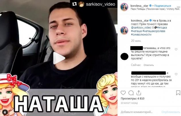 Многие знают Сергея Саркисова как перспективного блогера, который активно развивает свой блог в социальных сетях. Раньше он выкладывал различные фото с курортов, вечеринок и делился последствиями громкого веселья. Последние его видеоролики посвящены женским именам. Одним из последних стало имя «Наташа». В ролике Сергей красочно описали таких женщин, подобрав десятки комплиментов и приятные слов. Особенно эта запись понравилась Наташе Королевой, которая даже решила ее продублировать на своей странице.