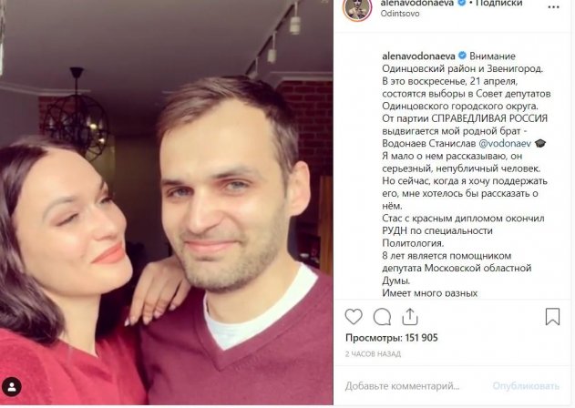 Уже сегодня на странице ведущей все-таки появилась публикация, посвященная выборам, в которых принимает участие Станислав. Неужели Алене стало стыдно? Алена в своем посте сделала акцент на том, почему она никогда не показывает брата: «Он серьезный, непубличный человек». Складывается впечатление, что Водонаева как будто опровергла все возможные домыслы интернет-публики о плохих отношениях со Станиславом наперед.