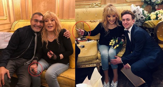 Однако, как выяснилось недавно, Пугачева так и не распрощалась со своей пагубной привычкой, из-за которой рискует сократить продолжительность своей жизни. 17 апреля артистка выступила на сцене Кремлевского дворца. Многие в соцсетях отметили, что примадонна поет вовсе не так как раньше – хриплый голос Пугачевой уже давно ассоциируется у поклонников с «предсмертными хрипами». Некоторые фанаты оказались правы – все дело в давней привычке исполнительницы. В сеть попали снимки, видимо, сделанные после концерта Пугачевой. На одном из них примадонна позирует с Артуром Гаспаряном. Можно заметить, что в правой руке Алла Борисовна держит сигарету. Вероятно, певица не догадывалась, что случайно «засветила» причину своих «предсмертных хрипов», когда позировала фотографам.
