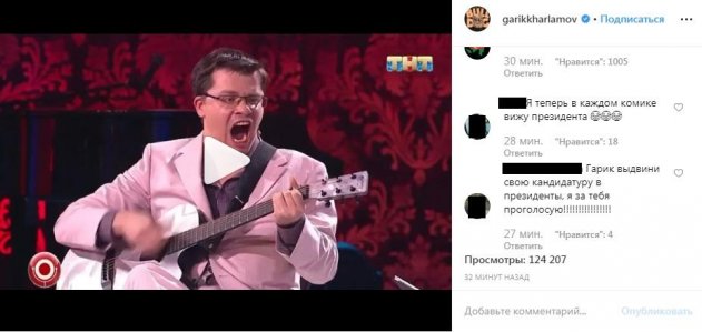 «Гарик, выдвини свою кандидатуру в президенты, я за тебя проголосую!», - говорили фолловеры Харламова в Instagram. Сам шоумен пока не прокомментировал такое желание своих зрителей, хотя не исключено, что Гарик ради шутки может на самом еле баллотироваться в президенты и составить конкуренцию Владимиру Путину.