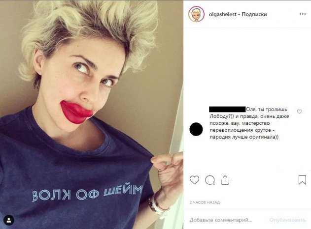 Ведущая Ольга Шелест не боится смелых экспериментов со своей внешностью, но, в отличие от многих звезд современного шоу-бизнеса, эти эксперименты скорее косметические, вроде необычной прически, яркого цвета волос, нового типа макияжа. Вероятно, звезда специально избегает любых пластических операций, ведь сегодня она высмеяла тех девушек, которые накачивают филлерами свои губы, а потом утверждают, что они полностью натуральные. Однако фанаты Шелест увидели в необычном фото не только пародию на тенденцию к «уродливой» красоте в целом, но и насмешку над одной знаменитой персоной. В частности, пользователи Сети думают, что ведущая поиздевалась над «губатой» Светланой Лободой.