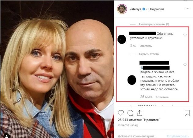 Поклонники стали рассуждать, по какой причине между супругами мог случиться разлад. Тогда некоторые предположили, что это могло произойти из-за первой жены Пригожина Лейлы Фаттаховой, которая, по их словам, и отдаляет его от законной супруги Валерии: «Вы несчастны из-за этой бывшей Иосифа. Уберите ее из своей жизни - и заживете спокойно».