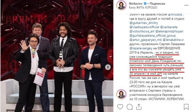 Филипп Киркоров на своём аккаунте рассказал шокирующие вещи прямо со съёмок будущего выпуска шоу Андрея Малахова «Прямой эфир» на канале «Россия». В выпуске для 30 апреля, как сказал сам Филипп, приглашенные знаменитости, Дмитрий Губерниев, Влад Топалов, Анастасия Волочкова и многие другие, провожали Сергея Лазарева на «Евровидение–2019». Однако удивительно было узнать, что в выпуске о Лазареве и его участии в конкурсе, Андрей Малахов решил заранее поздравить Филиппа Киркорова с днём рождения.