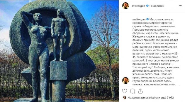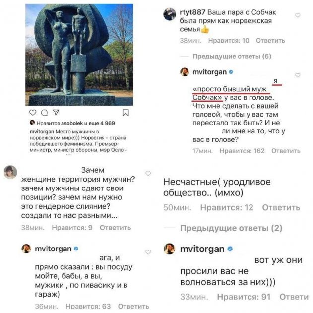 В своём аккаунте Максим рассказал о «месте норвежского мужчины в семье», но многим показалось, что он намекнул еще и на причину развода с Собчак. Виторган пишет у себя в профиле, что «Норвегия – страна победившего феминизма», где быть женщиной в некотором роде даже выгоднее, несмотря на «обделённость красотой», о которой писал Максим.