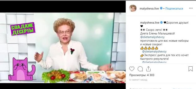 Сейчас Елена, вероятно, решила намеренно пиарить свои диеты, которые на самом-то деле не являются настолько полезными, как их описывает сама Малышева. Конечно, звезда утренних программ является популярной в Сети, Елену узнают и считаются с её мнением, прислушиваются к её советам. Однако, как заметно сейчас, имя телеврача сейчас коверкается самой Малышевой для продажи странных наборов пищи на неделю, обеспечивающих похудение.