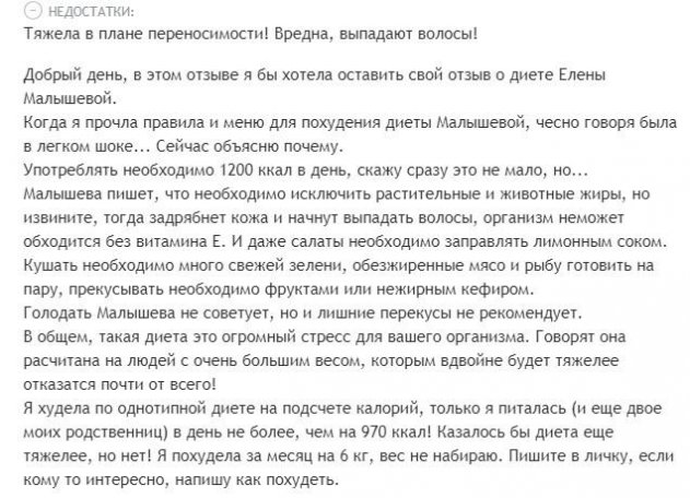 Диета, предложенная Малышевой, не точно отвечает всем требованиям качества и правильности, о которых она сама говорит. Многие в комментариях жалуются на то, что из-за питания по диете от ведущей начинаются некоторые проблемы со здоровьем, которые потом приходится лечить дорогостоящими лекарствами.