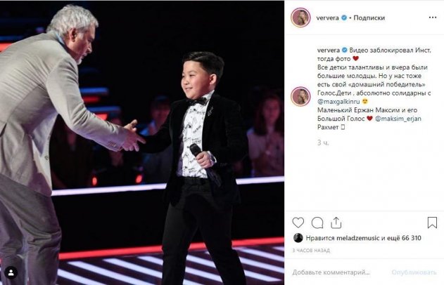 Кроме того, как заметили Брежнева и Галкин, Первый канал быстро удаляет видео с их страниц с еще одним участником шоу Ержаном Максимом, которого артисты считают лучшим. Телеканал будто боится того, что многомиллионная армия поклонников певицы и комика увидят сильные вокальные данные проигравшего мальчика и еще раз засомневаются в победе Абрамовой. При этом ролики с Ержаном, никем не тронутые в других неофициальных аккаунтах, набирают миллионы просмотров.