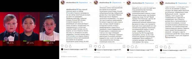 По поводу победы Микеллы Абрамовой в проекте «Голос.Дети» высказались уже многие артисты шоу-бизнеса. Не осталась в стороне и звезда «Универа» Мария Кожевникова. Актриса посвятила данному вопросу отдельный пост на своей странице в Instagram, заметив, что с журналистами на эту тему не захотела общаться, поскольку они могли «перевернуть» все ее слова.