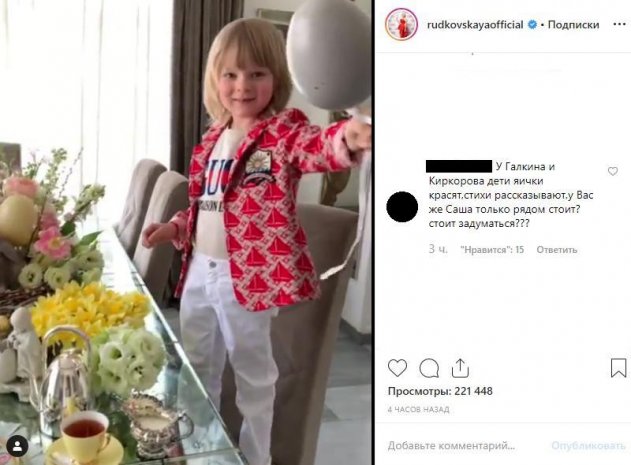 Например, сегодня звезда похвасталась «дрессурой» Гном Гномыча на Пасху. Мать нарядила мальчика в праздничную одежду и заставила стоять у празднично накрытого стола, пока сама Рудковская снимала видео для соцсетей.