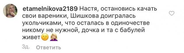 «Настя, остановись качать свои вареники, Шишкова доигралась укольчиками, что осталась в одиночестве никому не нужной, дочка и та с бабулей живет», - переживают хэйтеры за личную жизнь Анастасии.