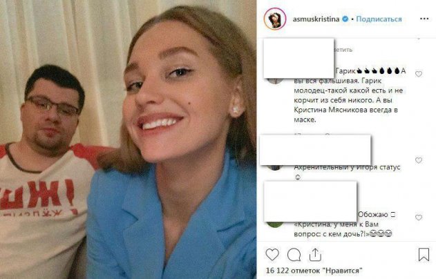 Сегодня она опубликовала совместную с Харламовым фотографию, на которой бодро позирует, улыбаясь своей доброй улыбкой, подписав: «Я замужем, а муж заженой». На заднем плане позирует явно уставший и замученный Гарик Харламов. Такое несоответствие образов возмутило поклонников - фанаты осудили Асмус за «фальшивую» жизнь. «Кристина Мясникова всегда в маске», - отметили фанаты.