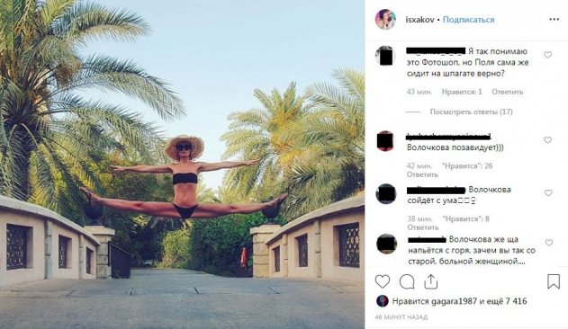 Не исключено, что именно этот эффектный шпагат по «лайкам» в соцсети через короткое время сможет даже превзойти растяжку балерины Анастасии Волочковой, которая в мини-бикини на Мальдивах также хвасталась фирменной «раскорякой». Пользователи Сети также оценили и стройную фигуру певицы, которая после вторых родов смогла вернуть былую форму.