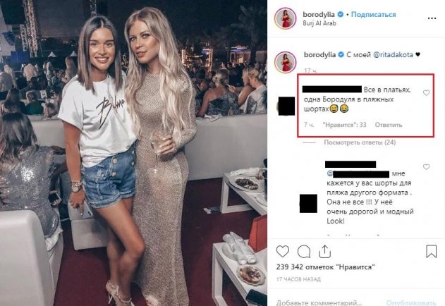 Многие фанаты супруги Курбана Омарова заметили, что на фоне других она заметно выделялась. Если другие звезды были одеты в вечерние наряды и длинные платья, то она выбрала совсем другой стиль. Так, Бородина пришла слушать поп-короля в шортах и футболке, за что ее потом и высмеяли в сети: «Все в платьях, одна Бородуля в пляжных шортах».