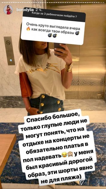 Подобные комментарии, похоже, очень задели телеведущую. Позже она оправдалась за свой вид в «сторис»: «Только глупые люди не могут понять, что на отдыхе на концерты не обязательно платья в пол надевать... Эти шорты явно не для пляжа».