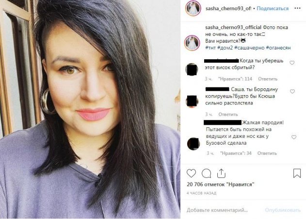Скандальная и одна из самых эпатажных участниц телестройки Саша Черно показала подписчикам в соцсети Instagram свой новый образ. Как выяснилось, девушка в очередной раз нарастила себе волосы и захотела данным преображением поделиться с фолловерами. Однако фанаты не оценили старания Саши выглядеть более женственно, а наоборот, обвинили девушку в подражании Ольге Бузовой и Ксении Бородиной.