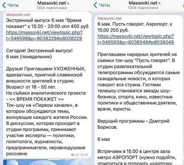 Пока вся Россия скорбит из-за трагедии в аэропорту Шереметьево, где из-за аварии при посадке самолета погиб 41 человек, Первый канал не теряет возможности использовать ситуацию для собственной выгоды. В частности, в сообществе, посвященном объявлениям о наборе актерской массовки, появились сразу два объявления о сборе людей для программ «Время покажет» и «Пусть говорят». «Приглашаем нарядных зрителей», - пишут одни заявители набора, а другие уточняют, что массовка обязательно должна быть «ухоженной, адекватной и славянской внешности». Такое объявление провоцирует на ряд вопросов, один из которых касается уточнения о славянской внешности. Неужели люди «неславянской внешности» не вправе переживать трагедию на камеру, как и остальные, которые прийдут в студии за 250-400 рублей?