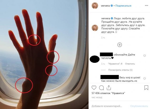 Вера Брежнева всегда отличалась умеренной худобой, которая позволяла ей выглядеть на сцене привлекательной даже в самых откровенных нарядах. Но, видимо, за последнее время звезда похудела еще сильнее. Недавно она поделилась в социальной сети новым фото, на котором телосложение не видно. При этом певица случайно «засветила» выпирающие кости. Действительно, кисть выглядит сильно истощенной. Не трудно представить, в каком состоянии может быть все ее тело.