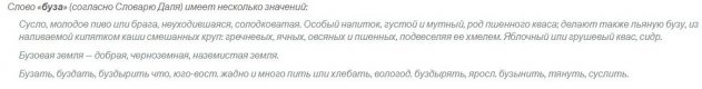 Другой словарь предлагает искать корни фамилии в слове «буза», которое означает «молодое пиво или брагу», или само действие - «пить».