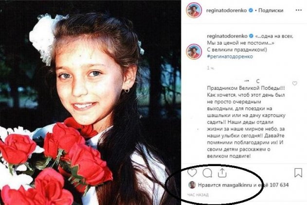О разгульном образе жизни Максима Галкина слагают легенды: череда любовниц, романы, неоднозначные знаки внимания коллегам. Не исключено, что новой «жертвой» шоумена стала известная ведущая «Орла и Решки» Регина Тодоренко. В соцсети девушка поделилась снимком из детства, где в честь 9 мая позирует в школьной форме с цветами. Стоит отметить, поздравление Регины не осталось без внимания: Максим Галкин «оценил» фото. Примечательно, что это уже не первый случай, когда артист оказывает неоднозначные знаки внимания замужней ведущей.