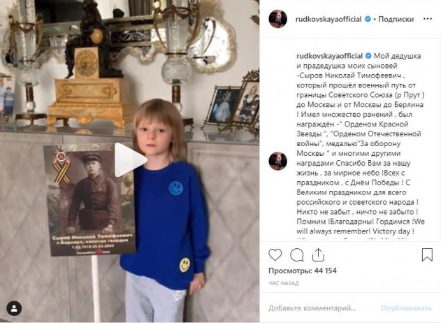 Но фигурным катанием супруга Плющенко не ограничилась, и продолжила «дрессуру» в другом русле. Рудковская устроила публичный «допрос» маленькому Саше, желая, можно сказать, «выдавить» из него поздравления ко Дню Победы, хотя сам мальчик явно был не в восторге от такой идеи. Видеозапись со скованным и, видимо, нежелающим подчиняться требованиям матери мальчиком Рудковская опубликовала на своей официальной странице в Instagram. Видимо, она сделала это не из-за любви к ребёнку, а из-за желания в очередной раз «пропиариться» и поддержать своеобразный «флэш-моб» в социальных сетях.